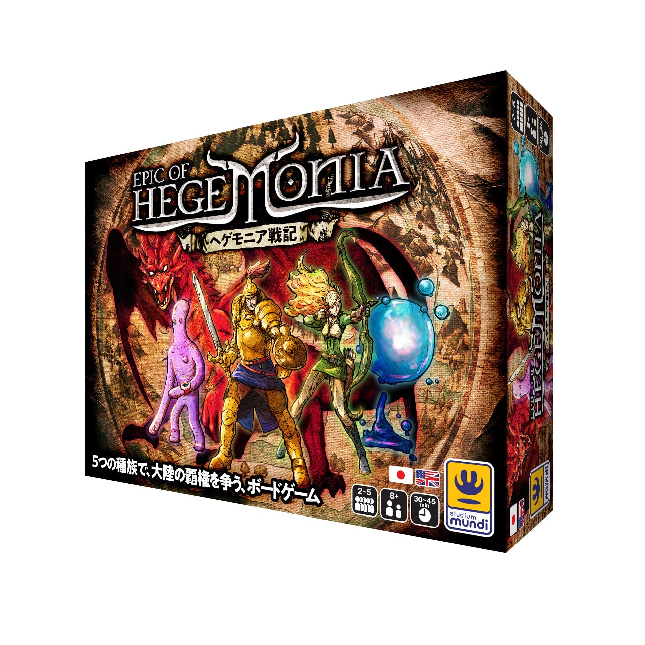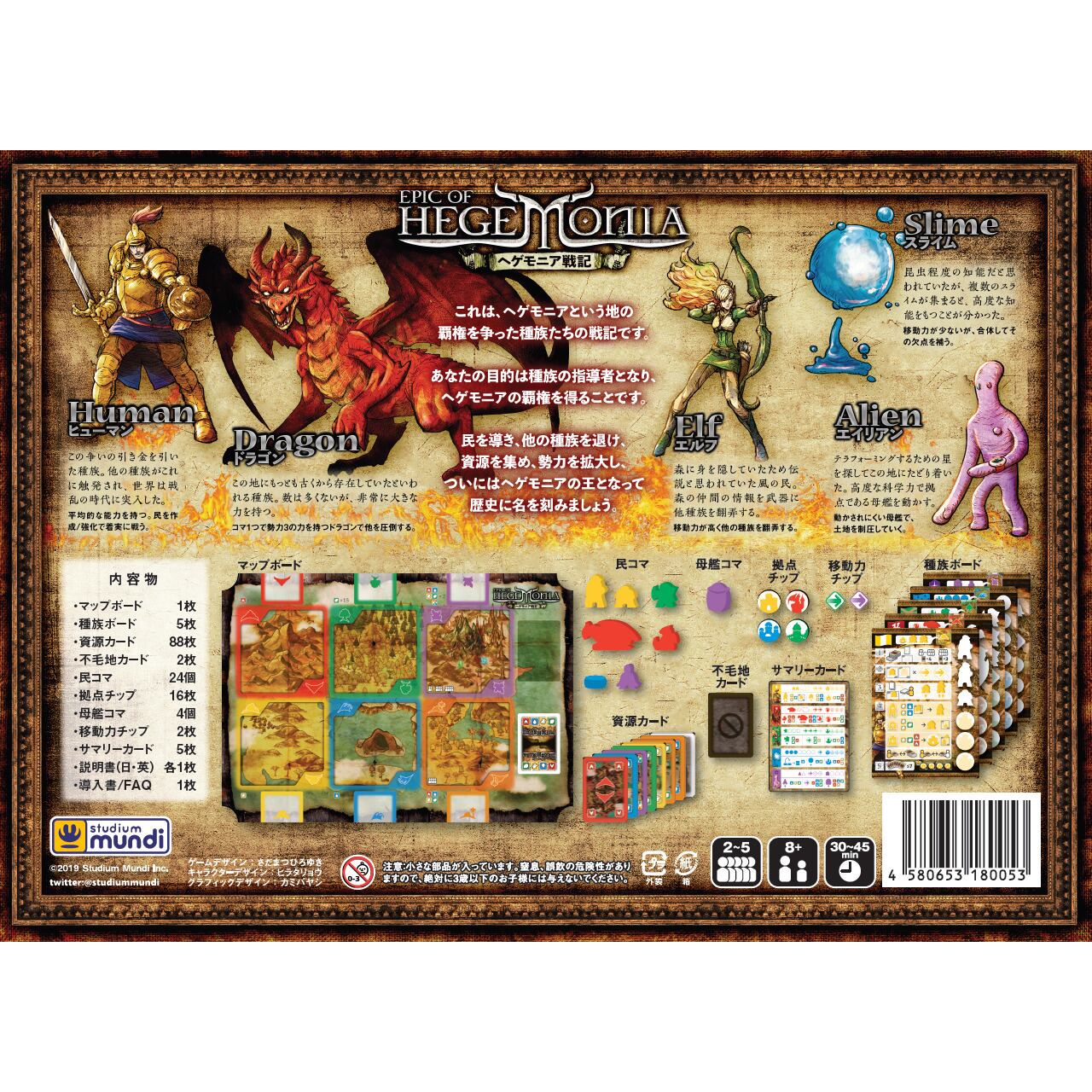 ヒューマン、ドラゴン、エルフ、スライム、エイリアン。個性的な 5 つの種族が大陸の覇権を争うボードゲーム。民を使って攻め込み、他の種族を追い出し、資源をゲット。時には外交し、資源を使って勢力を拡大。4つの拠点を建てれば勝利だ!
