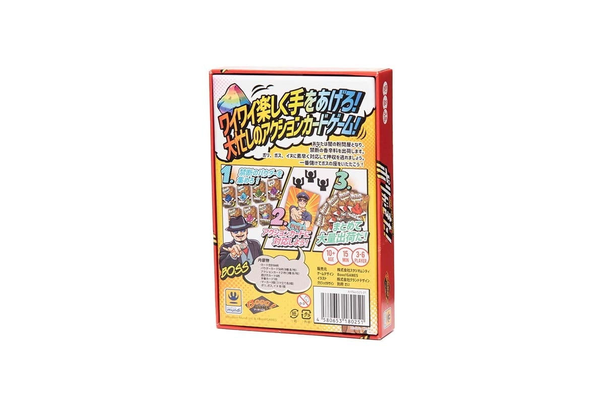 あなたは闇の粉問屋となり、禁断のパウダー(※香辛料です)を出荷します。素早いトレードを繰り返して手札となるパウダーを揃えたり、突如現れるポリ、ボス、イヌたちに素早く対応して押収を逃れつつ、一番儲けてボスの座をいただこう!
